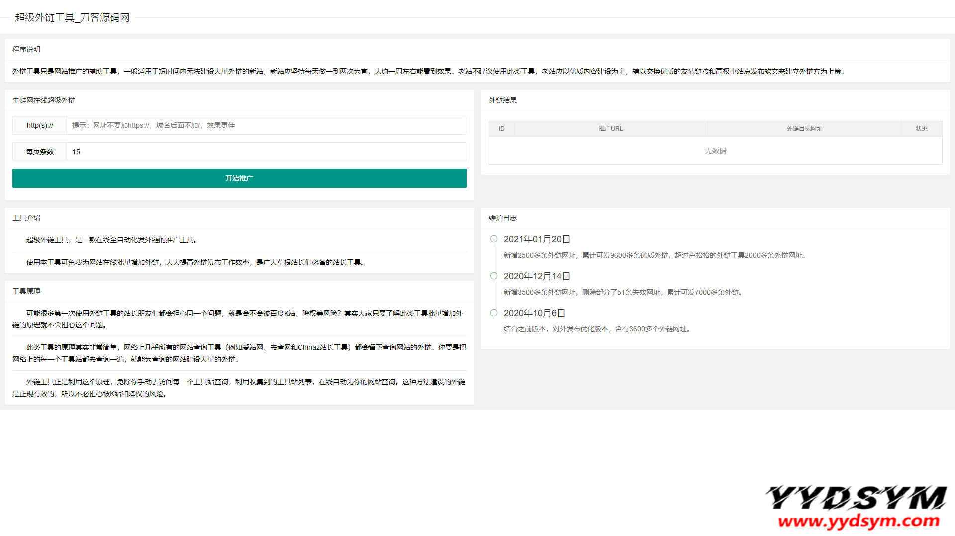 超级外链工具是一个在线为网站自动建设外链的站长工具,界面偏向清爽风格,大气简洁,还带有进度条,目前整合了9600多条外链网址,你可自行修改 urls.txt 文件对网址进行添加或删减。