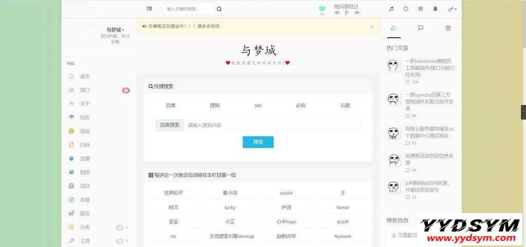 当前位置: 首页源码大全新闻博客正文 简介: 由于与梦城博主的主机过期,所以出售了自己的博客数据,这个“梦与城”’博客数据站+API站+数据库,我是从别人手中中花了几百块钱买来的,由于没有CDN以及自己能力问题没能把API站搭建成功,博客里面有许多独立页面的模板,可以用于Handsome主题模板,现在免费分享,带所有数据(文件没有动过)。因为一些CCS、JS、图片都在CDN文件,所以搭建需要有CDN存储器才能更好的显示页面! 图片: 与梦城API站截图: API网站Typecho博客与梦城博客数据站 收藏 链接