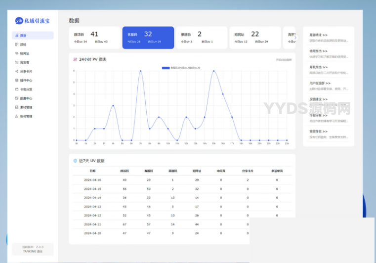群活码、客服码、渠道码、短网址、淘宝客中问页、多项单页、分享卡片当天总访问量统计、各时段访问量统计,今天IP和昨日IP统计、近7天IP数据展示。