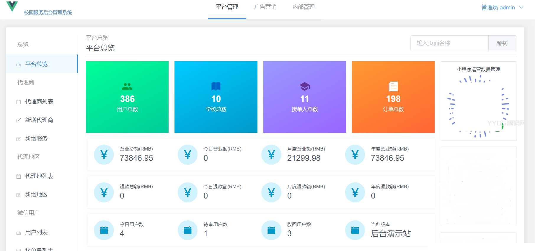 2.管理员可以查看代理的服务信息、运营数据、订单数据。还可以对其进行启用账号、禁