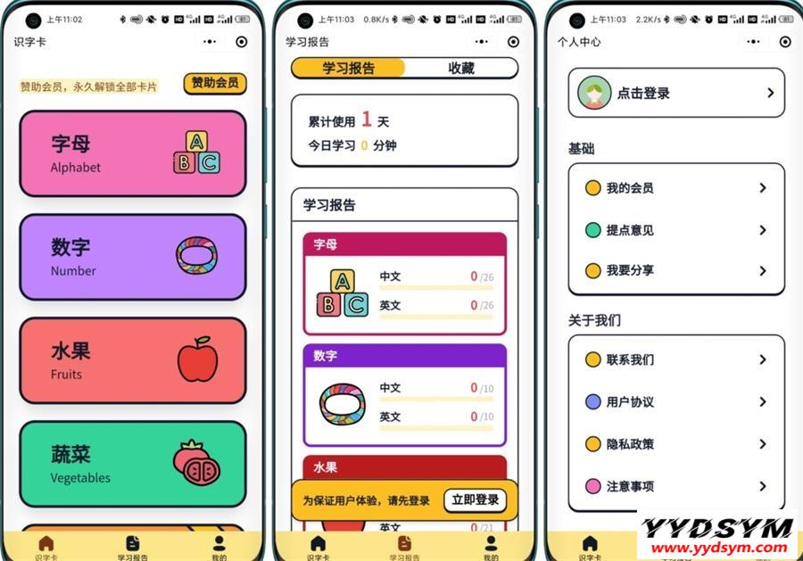 当前位置: 首页源码大全教育培训正文 简介: 【嘟嘟早教卡】是专门为 3-6 岁婴幼儿童学习普通话、英语研发的早教启蒙认知识字的小程序 小程序由 Taro 及 Tailwind CSS 构建而成,后台管理使用 Laravel 及 Tailwind CSS 想法源于小时候玩的认知卡片,基本大部分家庭都买过认知卡片,我按照那些卡片分类,收集了一些常见的物品,加入中文英文音频,学习统计。目前只做了小程序版,图片素材是国外买的,语音用的思必驰接口生成的 图片: 嘟嘟早教源码 收藏 链接