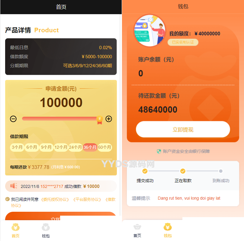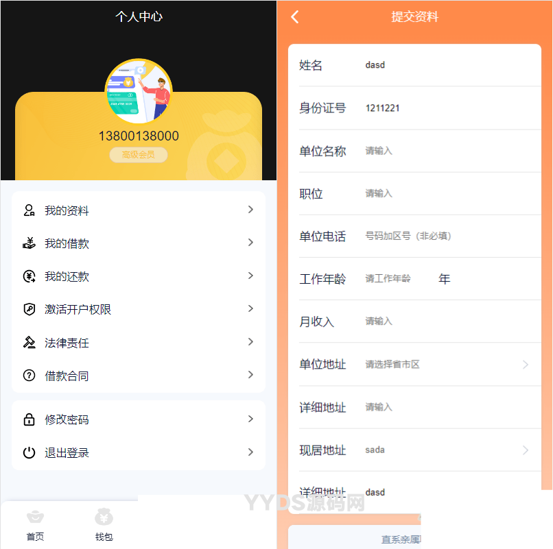 当前位置: 首页源码大全金融理财正文 资源介绍 后台 D理 前端均为vue源码,前端有中文和越南语 前端ui黄色大气,逻辑操作简单,注册可对接国际短信,可不对接 用户注册进去填写资料,后台审批,审批状态可自定义修改文字显示 预览截图 贷款源码 收藏 链接