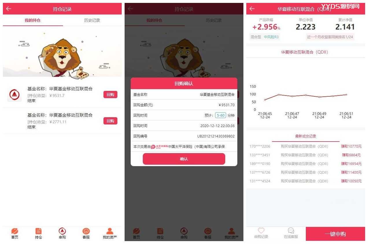别人二开的东西,华夏基金投资理财源码 基金理财程序,整个前端重构,独一无二的功能逻辑,融合了抢单和基金理财的产品逻辑,大概的逻辑是:抢单、购买、然后卖出获益。具体要比这个复杂很多,就留给用的上的人吧。