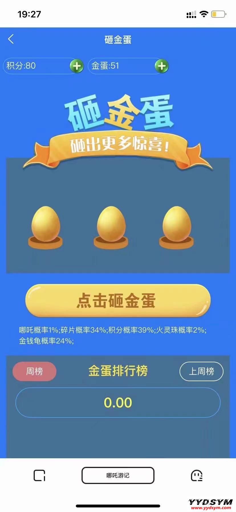 砸蛋可设置概率获得积分、哪吒、碎片、火灵珠、金钱龟。
