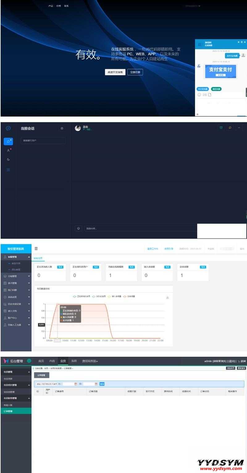 客服转接、历史消息查看、数据统计、来源追踪、问候语、桌面通知、夜间模式切换