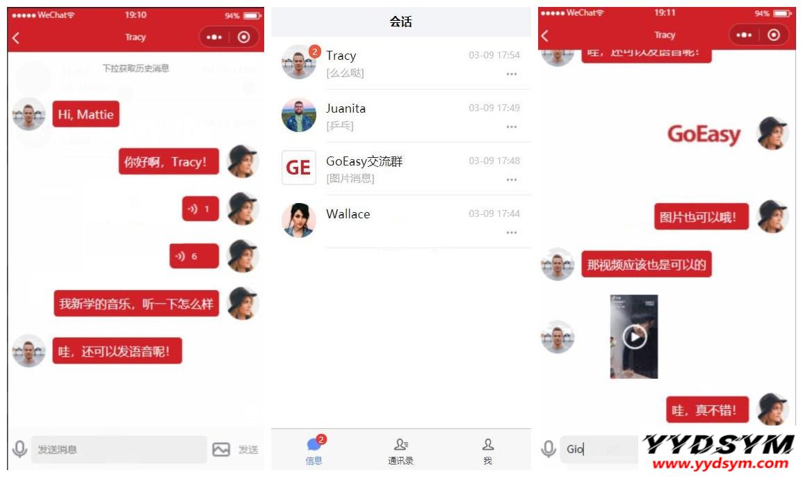 GoEasy小程序即时通讯源码是一个基于GoEasy提供的WebSocket通讯服务,实现的小程序即时通讯,支持一对一单聊、群聊、会话列表、上下线提醒、历史消息、离线消息,支持发送图片、视频、语音,更多功能可以下载下来体验一下。