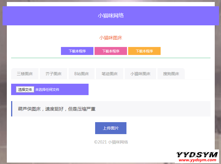 当前位置: 首页源码大全图片图床正文 简介: 小猫咪图床源码V1.8,无需数据库,拥有叁楼,戒指,bilibili,搜狗,本地等7个图床。 使用说明: 后台为http://域名/admin 默认key为123456 修改key地址http://域名/admin/key.php 建议修改后台地址 图片: PHP图床系统图床系统源码 收藏 链接