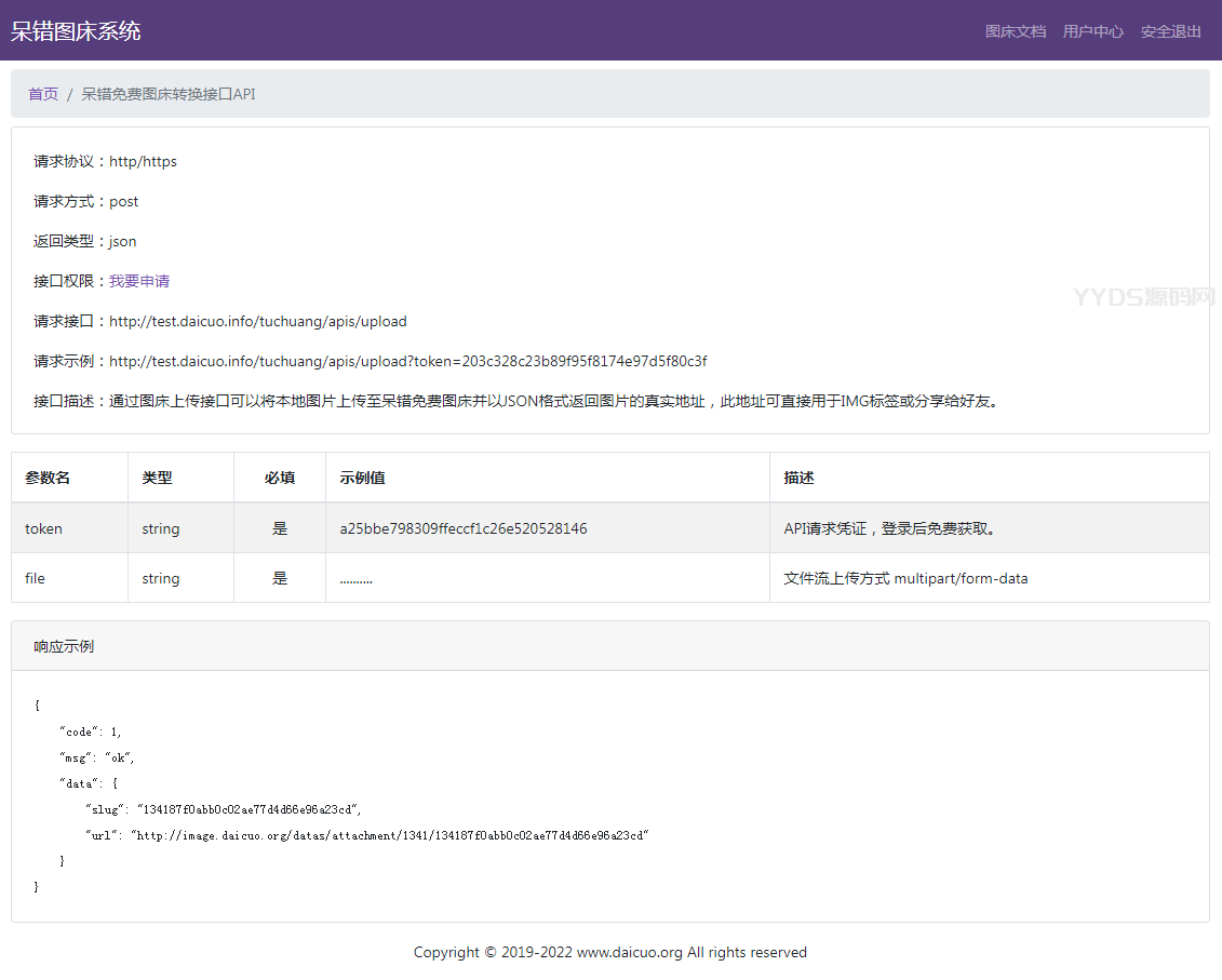 通过API上传接口可以将本地图片上传至呆错免费图床并以JSON格式返回图片的真实地址。