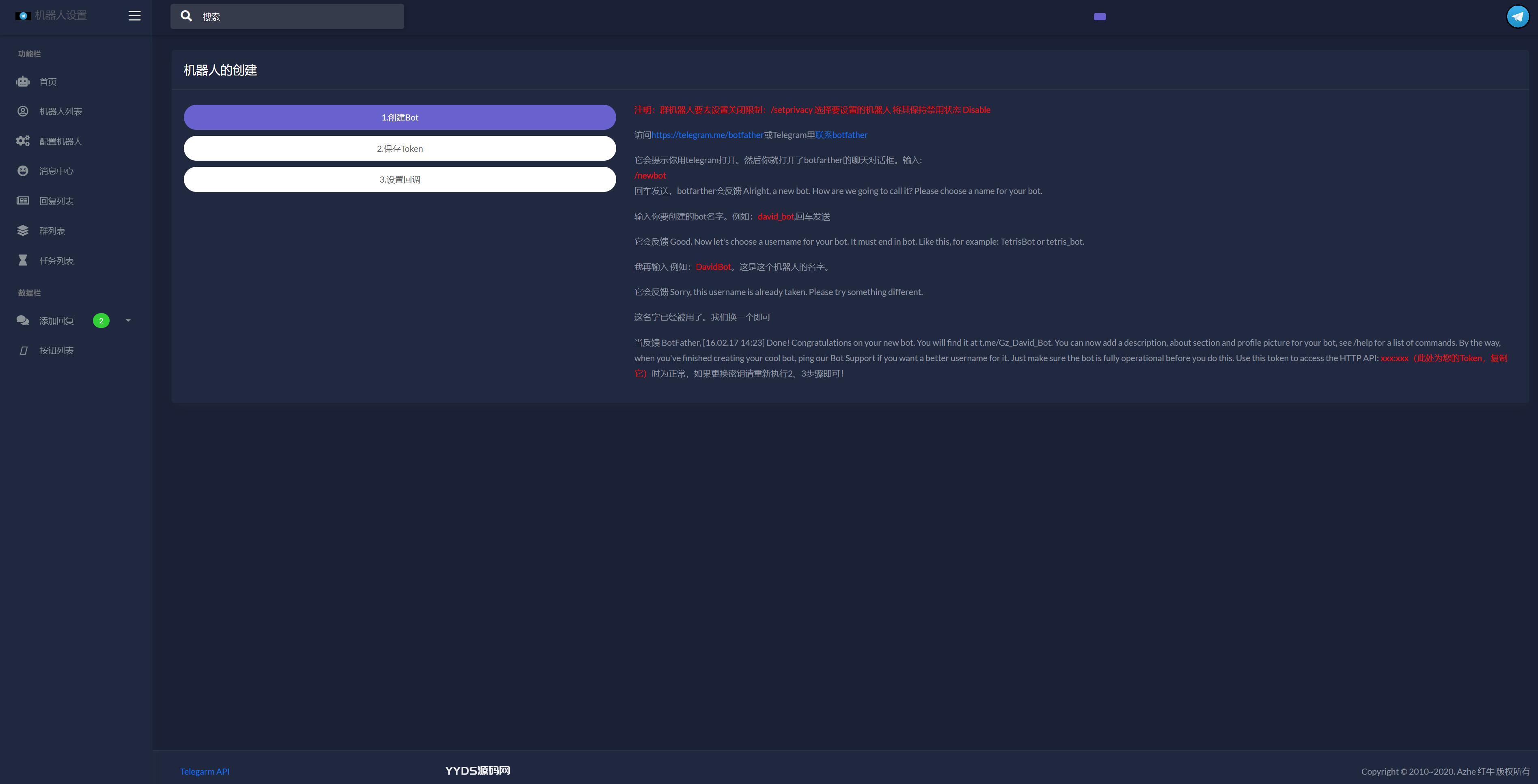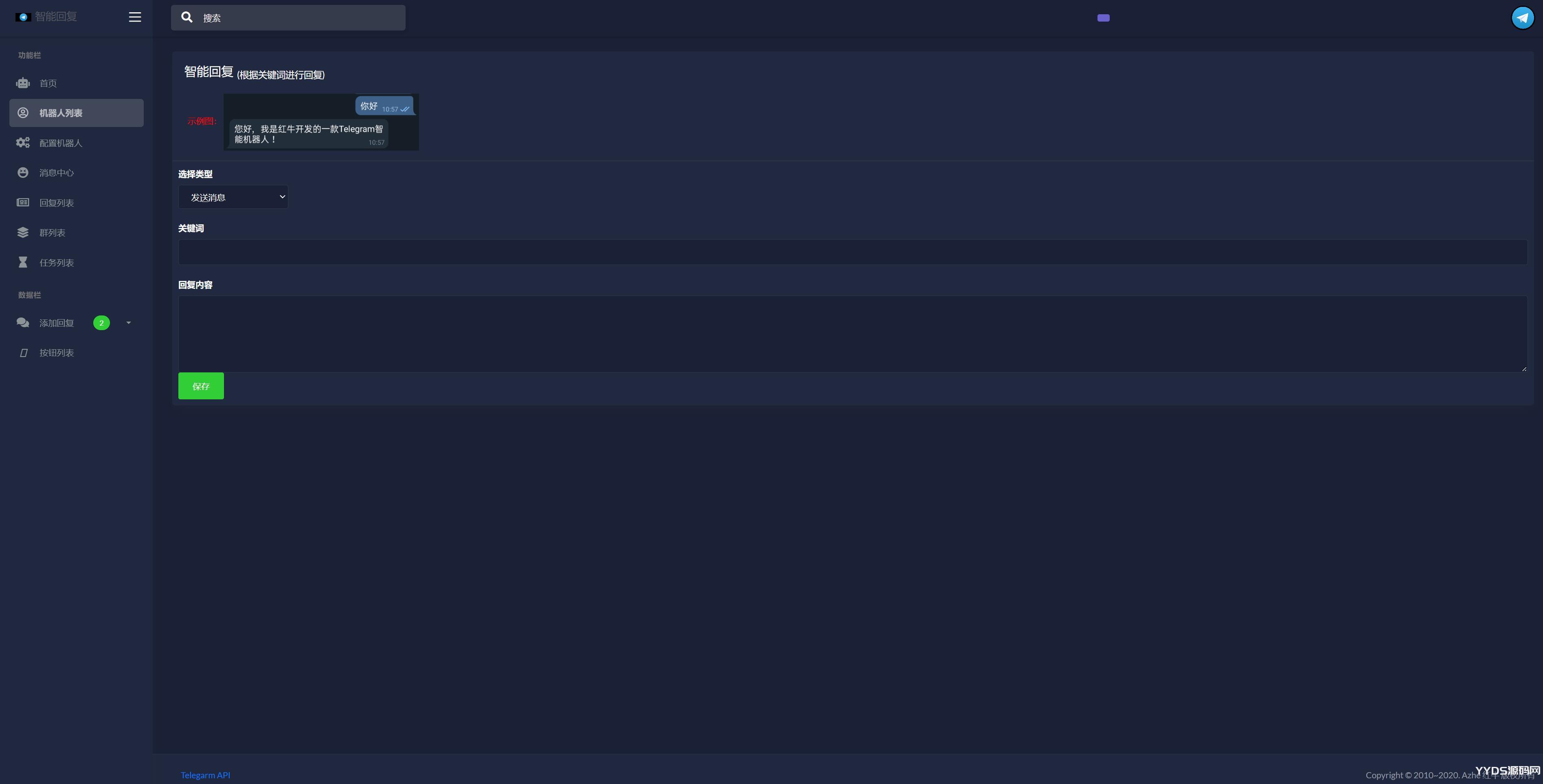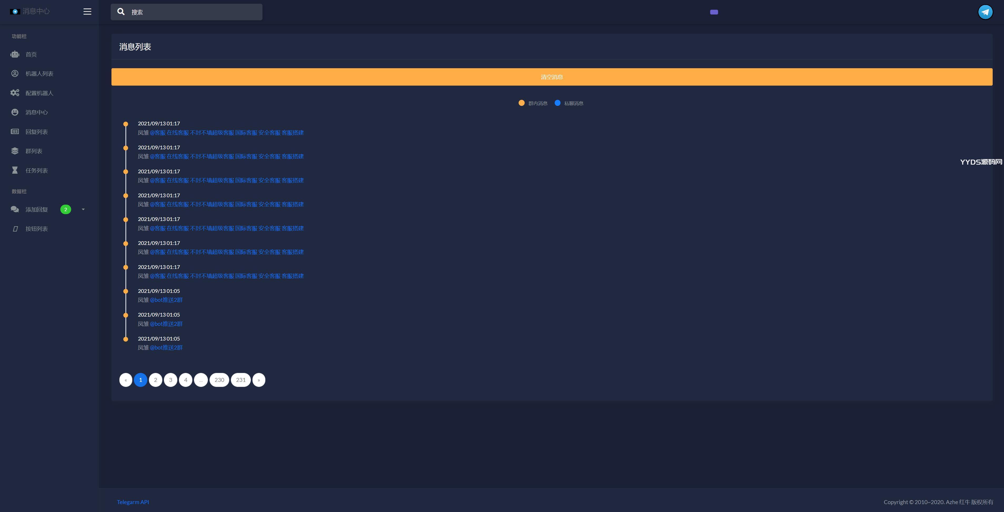 当前位置: 首页源码大全在线工具正文 简介: 源码是Telegram电报消息自动回复的源码,不是电报群发系统,别看错了 系统支持多个添加机器人、支持关键词回复、支持设置按钮回复、支持个人、群、频道等的消息处理,另外支持消息定时推送。 基于thinkphp开发的TG电报机器人系统,支持关键词回复 后台登录地址:/admin 后台账号密码:admin/123456 图片: Telegram消息自动回复电报机器人 收藏 链接