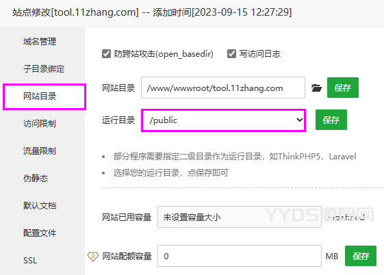 - 4. 宝塔面板后台设置域名运行目录设置 /public
