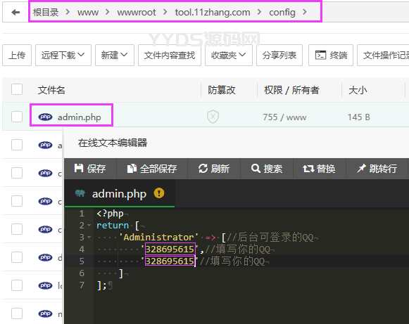 8、配置后台管理员账号 /config/admin.php 设置你的后台登录QQ号,如下图;