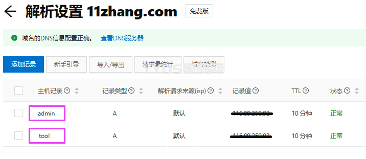 9、配置完成之后,前台域名地址为:tool.11zhang.com,后台域名地址为:admin.11zhang.com,并在你的域名管理控制台中,添加2条A记录,如下图。