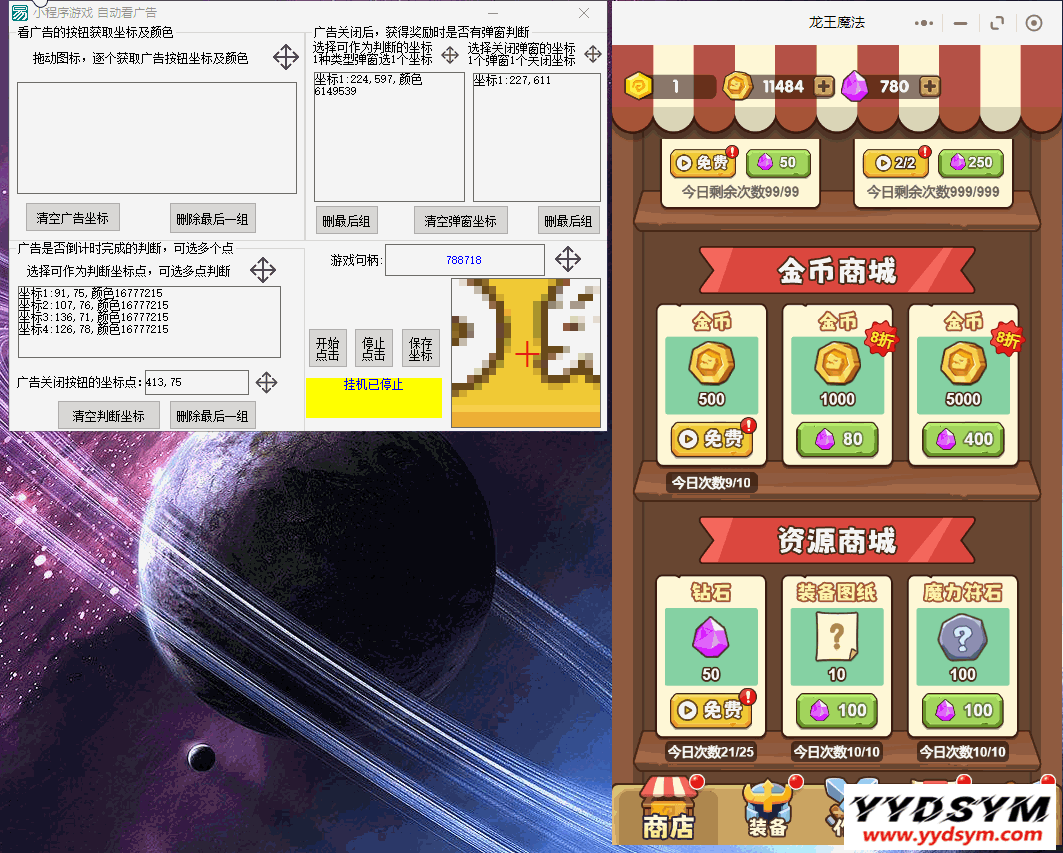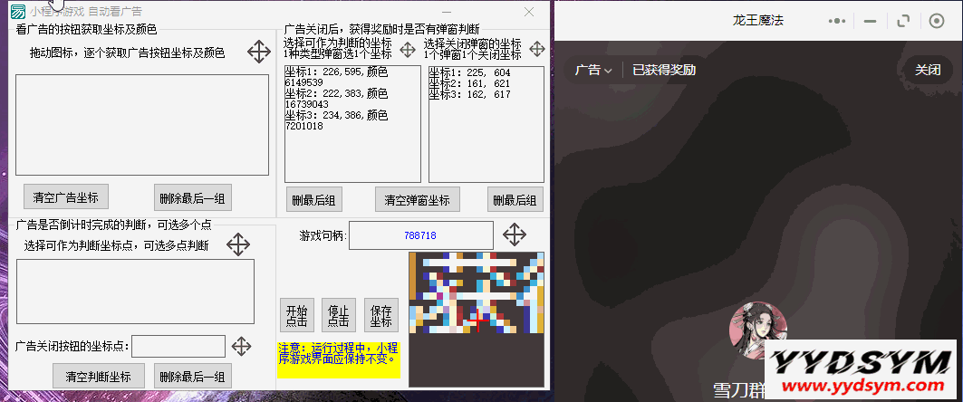 一、根据选择的看广告按钮点,循环点击看广告二、选择可判断广告是否播放完成的坐标颜色点(可多选),判断广告是否播放完毕,然后选一个可关闭广告的坐标点
