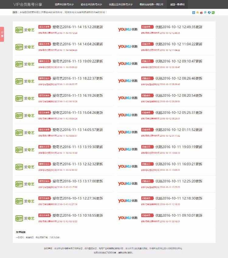 当前位置: 首页源码大全其他源码正文 介绍: 影视VIP账号资源分享网站PHP源码_爱奇艺优酷迅雷账号分享网站,全自动采集发布 迅雷优酷爱奇艺账号分享,自带自动采集帐号共享,无需人工更新内容程序使用PHP+Mysql+Tinkphp 最新 优化了些小细节,去掉自带的广告。 图片: 全自动 收藏 链接