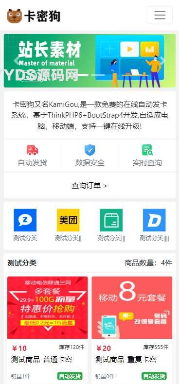当前位置: 首页源码大全发卡系统正文 资源介绍 基于thinkphp6+BootStrap4开发的卡密狗PHP自动发卡系统源码+自适应电脑端+移动端,支持一键在线升级; 测试运行环境:Nginx+PHP7.2+MySQL5.6 系统特点 1、自动发卡/手动发卡两种模式 2、普通卡密/重复卡密两种卡密模式 3、支持批发价格 4、对接个人免签支付,个人无需营业执照即可对接支付 5、免登录快速购买,快速查询卡密,更加方便快捷 6、两种布局:图片布局/列表布局,可自由设置 预览截图 卡密狗发卡系统自动发卡系统 收藏 链接