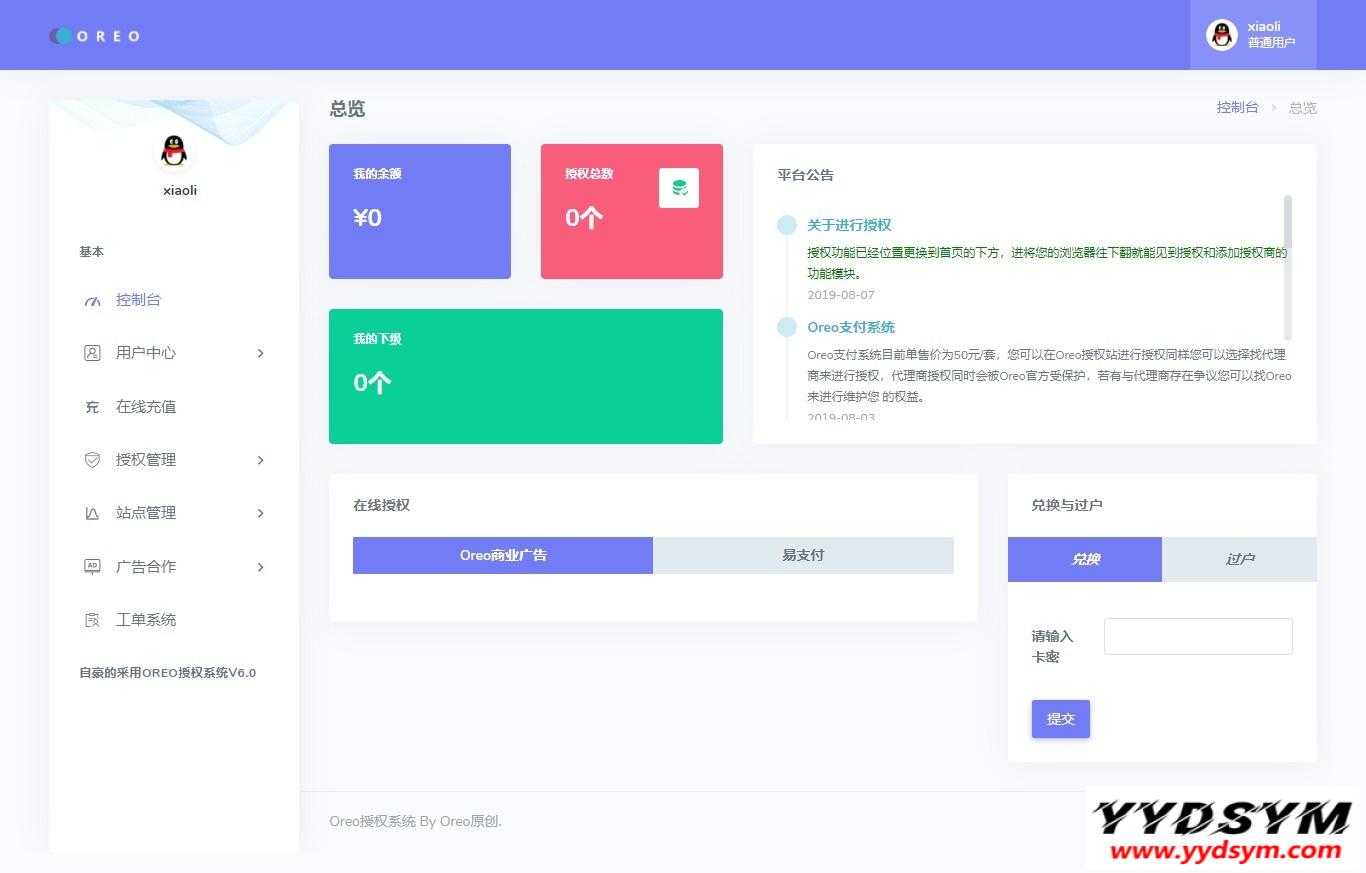 Oreo授权系统几乎所有的程序都能整合使用,包括您的app和计算机程序,支持多程序授权、在线支付、权限分配、内测用户、在线升级、商业广告、工单系统、盗版管理、自定义用户等级、自定义授权提示、授权程序、到期时间设置、IP验证、版本验证、IP域名双重验证、单域名验证、泛域名验证、余额卡密、授权卡密、授权过户、上下级关系、远程静态资源、多用户注册、在线授权、权限升级、补差价升级等功能.