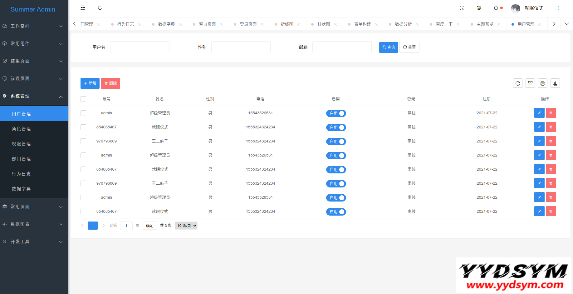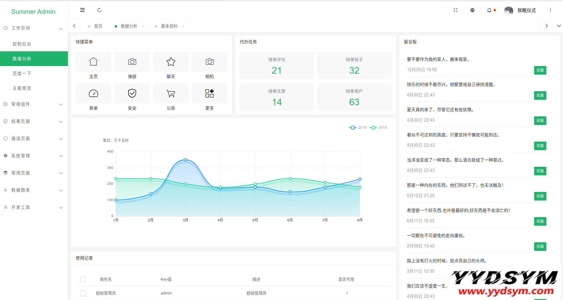 当前位置: 首页源码大全系统后端正文 简介: 一款漂亮有质感的Layui后台模板SummerAdmin 漂亮有质感 完整的页面 有良好的设计语言 适合后台二次开发用 多色彩多主题切换 多标签,标签自带完整的关闭功能 表单构建功能,适合快速开发 图片: 控制台 完整的权限页面 纯白主题 登录页面 Layui后台SummerAdmin网站后台模板 收藏 链接