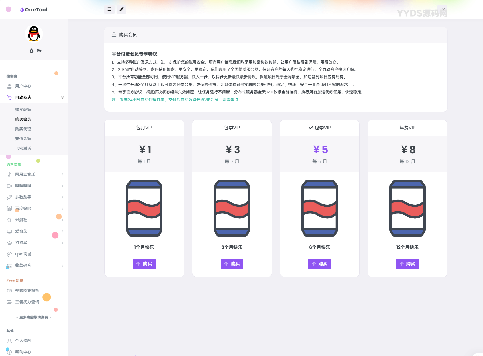 当前位置: 首页源码大全任务兼职正文 简介: OneTool十二合一云任务平台多任务挂机平台系统源码 目前可用功能: 1.【网易云音乐】 2.【哔哩哔哩】 3.【百度贴吧】签到 4.【视频解析】 5.【Epic商城】 6.【运动助手】 7.【爱奇艺】 8.【米游社】 9.【王者战力查询】 10.【QQ⭐】 11.【收款码合一】 二改: 基于大神去授权,修复 视频解析,增加 王者战力查询 美化ui模板首页,登录页,用户页 用户端图片: 管理端图片: OneTool云任务挂机云挂机系统任务挂机平台任务挂机系统 收藏 链接