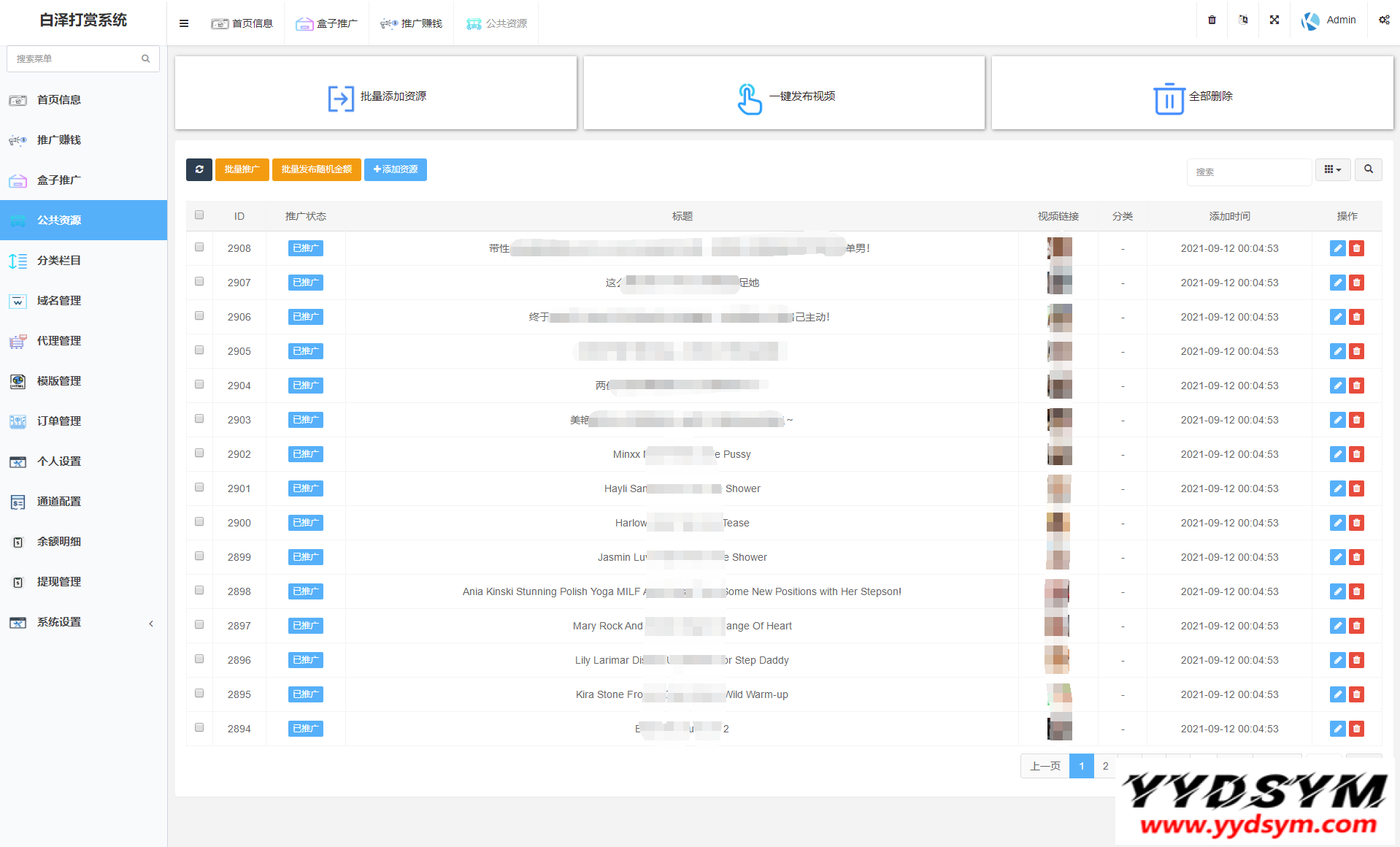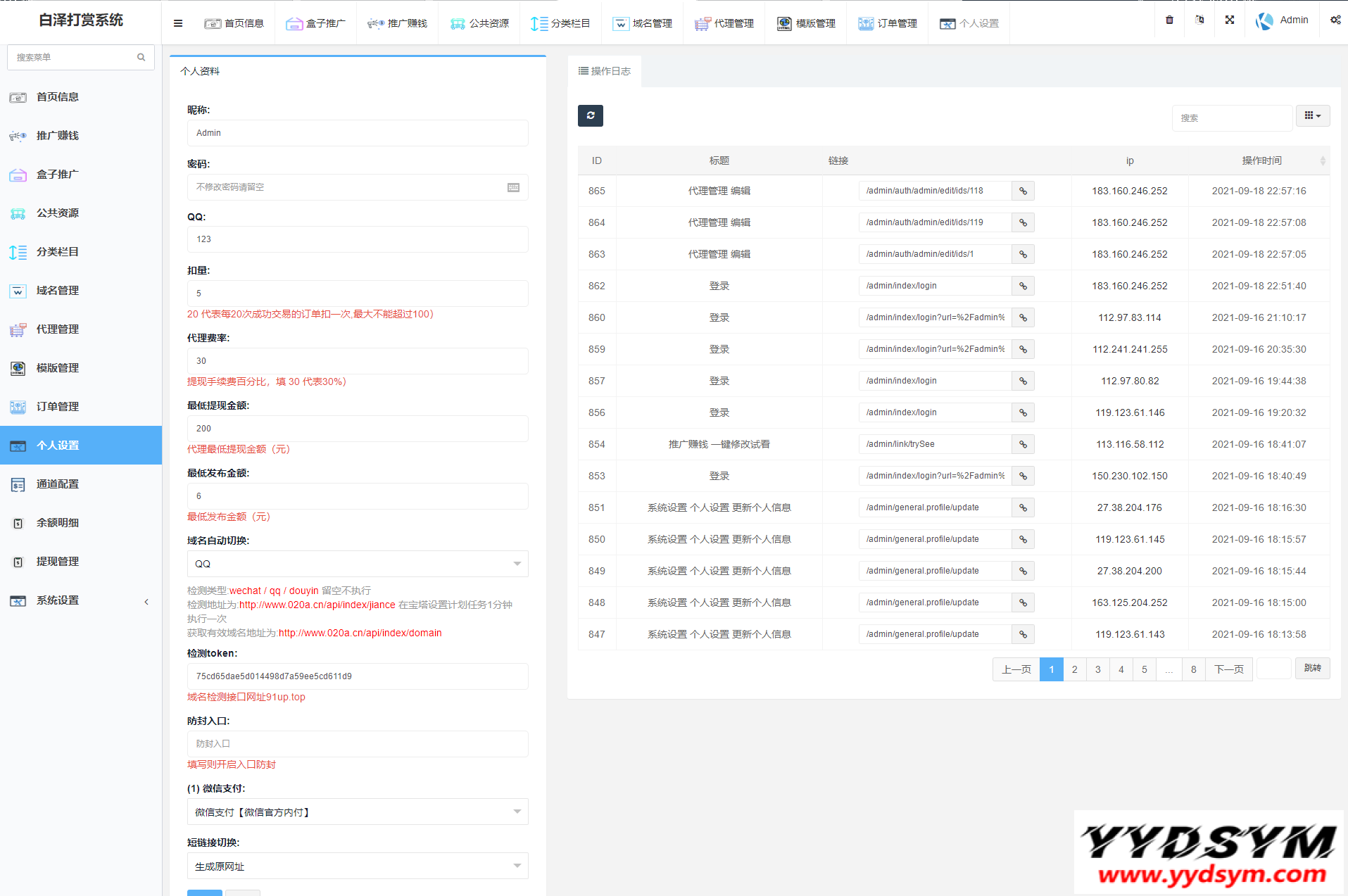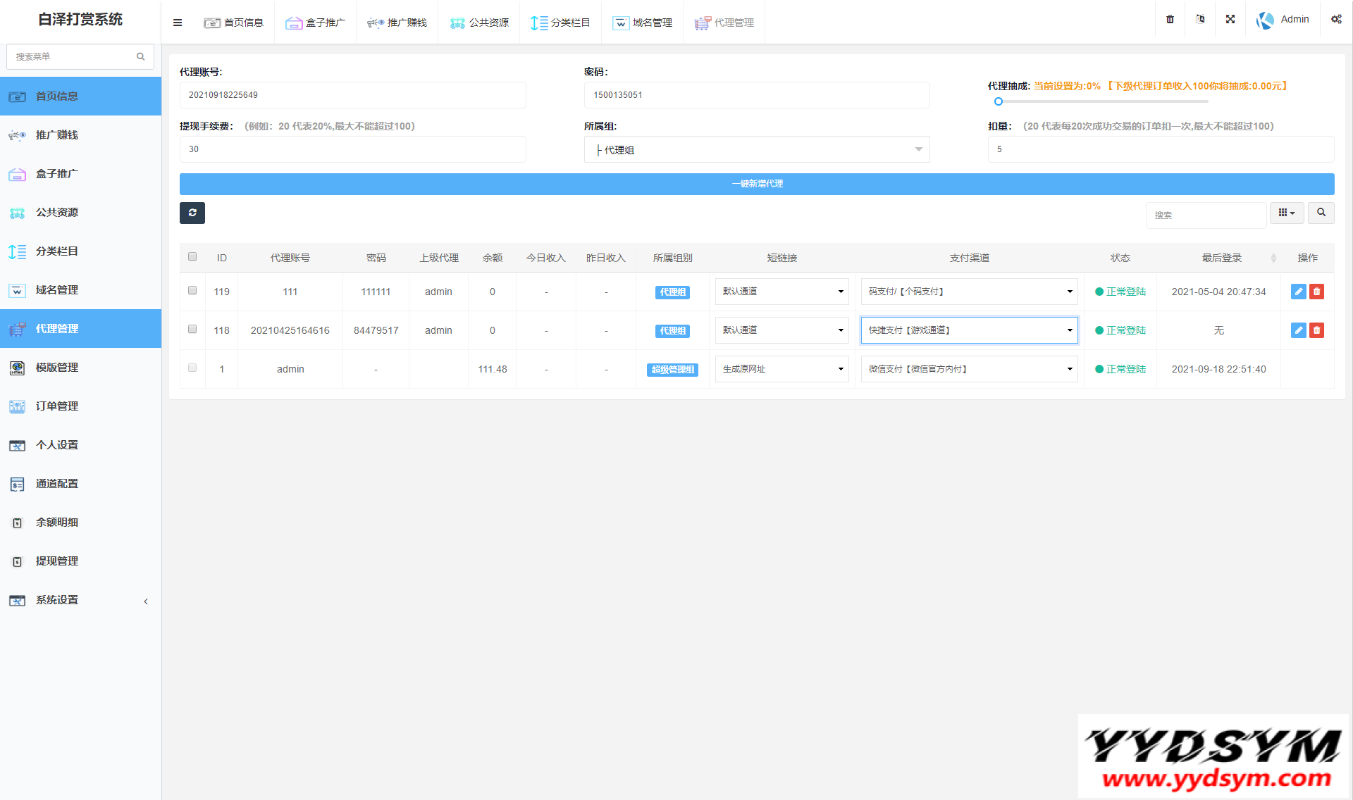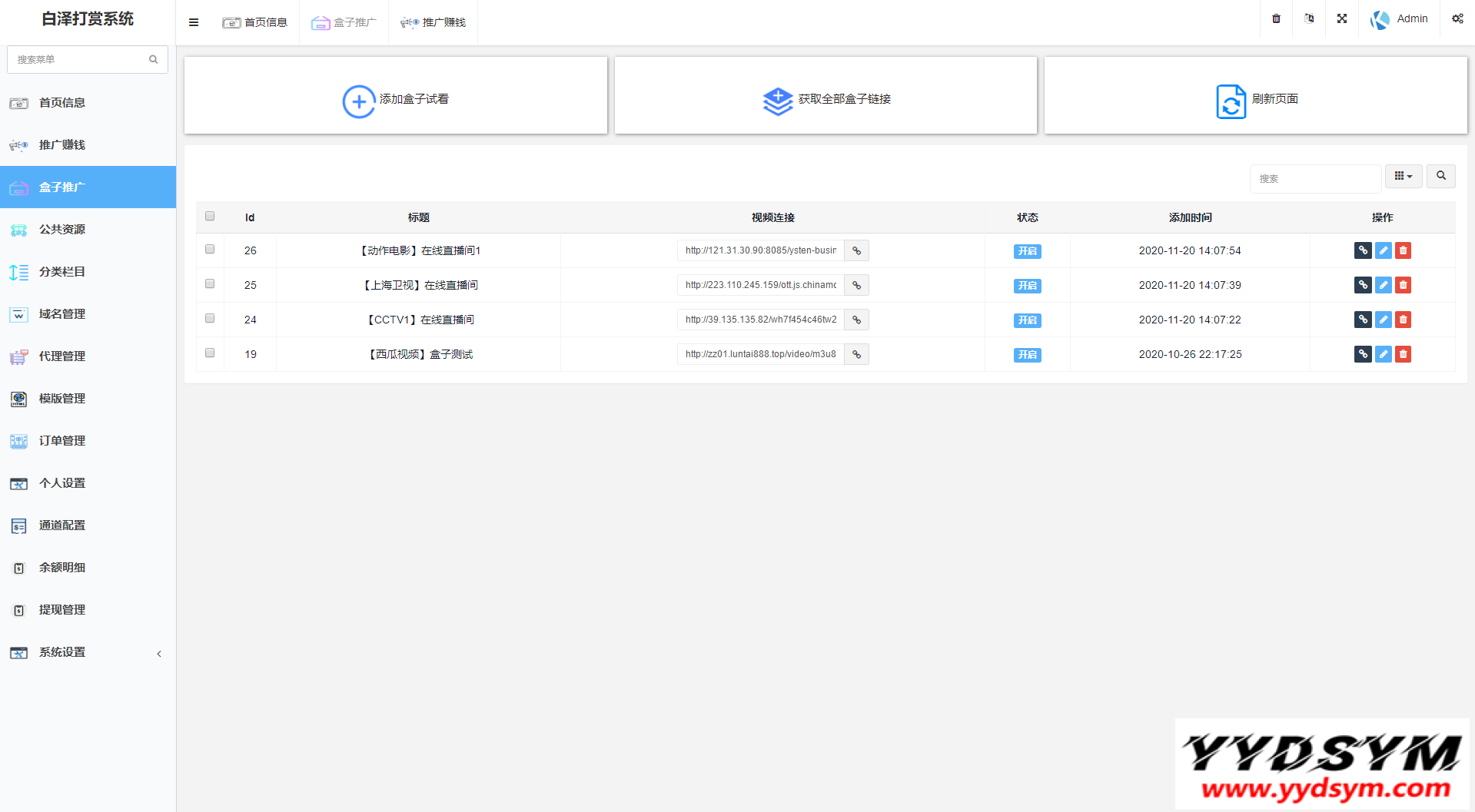 当前位置: 首页源码大全视频音乐正文 简介: 图片为实测截图,支付对接,盒子推广,域名防封,等一系列功能皆为正常 用途就是,比如,你要看视频,就得支付,可以包天,包周,包月 前台截图就不发了,懂得都懂 后台账号密码:admin/yydsym.com 本程序仅供研究学习使用,切勿商用以及违法运营! 图片: 付费打赏系统视频打赏系统 收藏 链接