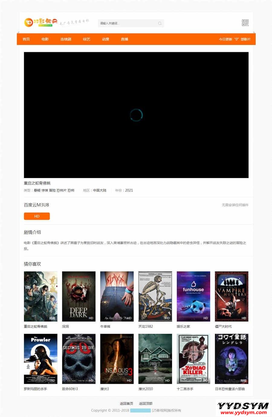 当前位置: 首页源码大全视频音乐正文 介绍: 一款橙色风格25影视网主题模板,苹果cmsV10版本,自适应手机端,已测试,完美无错,效果看图。 主要为影视模块,直播接口已经失效,自行更换,无其他模块。 图片: 播放页截图: 手机端截图: 苹果cms模板影视网站模板 收藏 链接