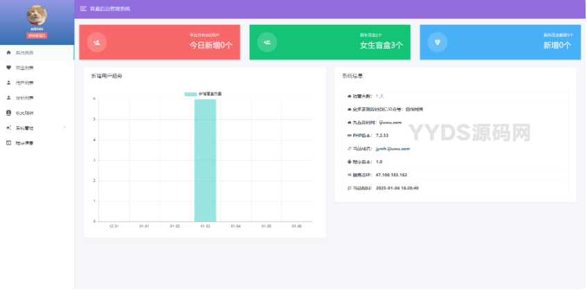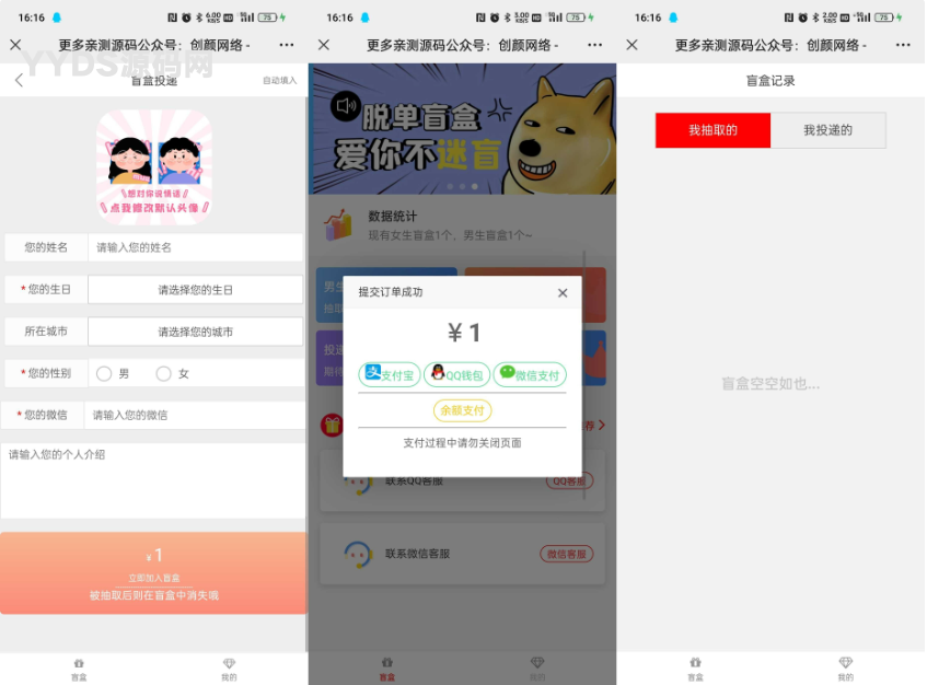 当前位置: 首页源码大全婚恋摄影正文 资源介绍 最新PHP开发的交友盲盒系统源码,免微信公众号,此款一元抽纸条盲盒交友源码已对接易支付,无需商户号,再也不用担心商户被封了。 免公众号网页版盲盒源码,不用再去花300块认证服务号啦,盲盒交友持续火爆中 搭建说明: PHP版本:PHP7及以上 导入数据库文件到数据库 修改config.php文件数据库配置信息后台地址:域名/admin 账号:admin 密码:123456 预览截图 交友恋爱源码恋爱盲盒源码 收藏 链接
