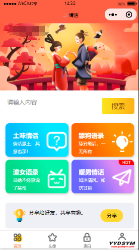 当前位置: 首页源码大全婚恋摄影正文 简介: 恋爱话术表白头像漫画制作微信小程序 恋爱信封表白制作生成(内涵N种文案)、头像转漫画制作、土味情话、舔狗语录、渣女语录、暖男情话等等多种功能 使用方法: 使用微信开发者工具,导入恋爱小程序源码,然后设置好合法域名提交审核即可,合法域名自己查找添加 效果展示特点:无需服务器和域名。 图片: 头像微信话术 收藏 链接