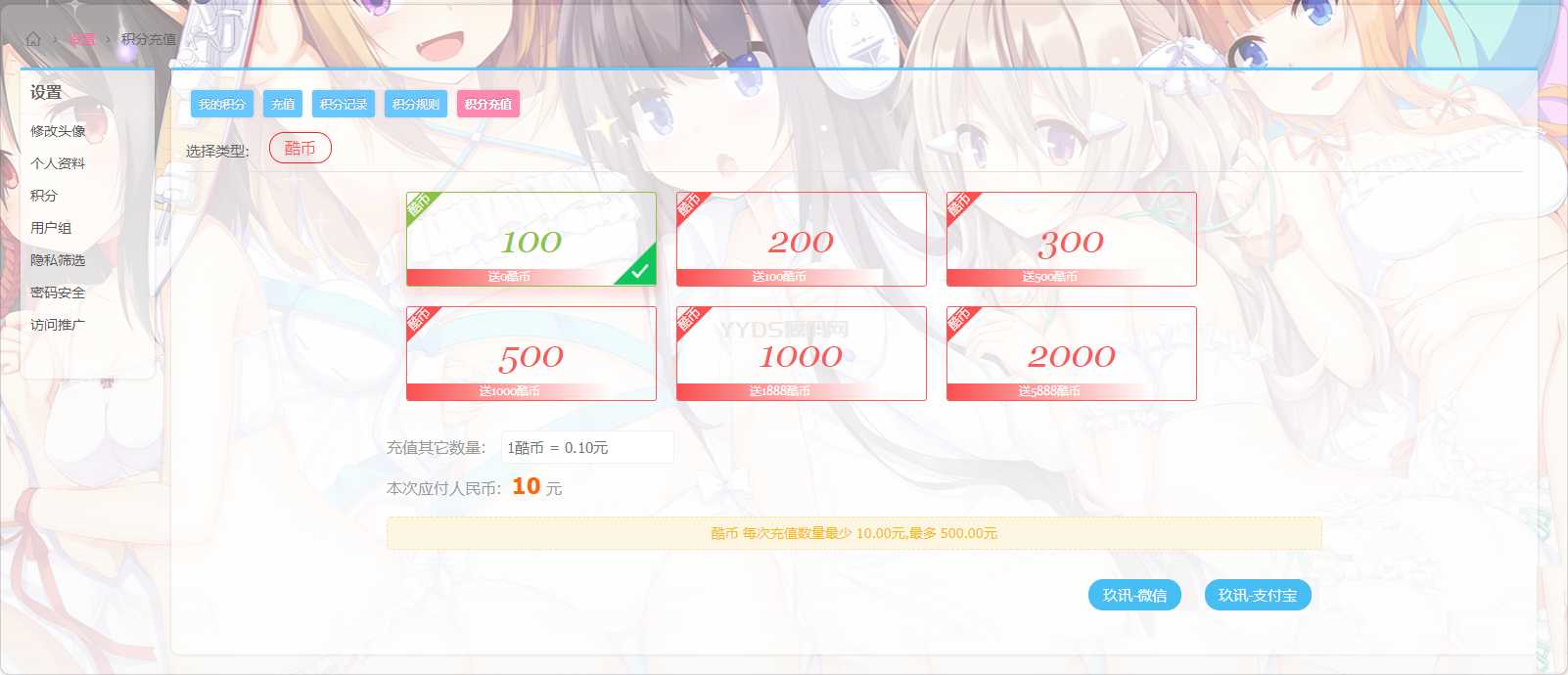 5.积分充值支持多种积分单独充值,每种积分可单独设置赠送其他积分;