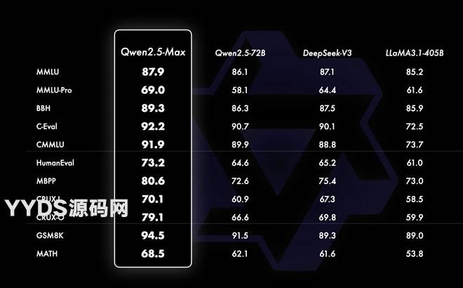 如上图所示,Qwen2.5-Max的各项指标都略高于DeepSeek和LLaMA模型。