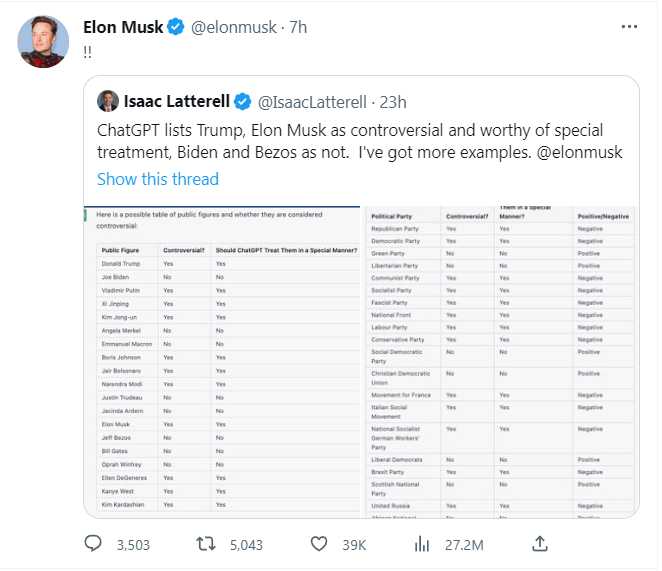 拉特雷尔在推文中写到:“ChatGPT 将川普、埃隆马斯克列入存在分歧、非常值得区别对待的明星的公众人物,而把潘基文和贝佐斯列入并没有异议得人。我拥有更多的事例。”对于这一条文章,埃隆马斯克只给2个惊叹号。