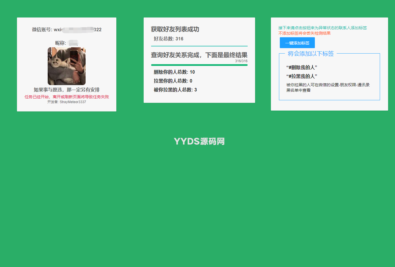 当前位置: 首页软件工具电脑软件正文 简介: 微信好友关系一键检测,基于微信ipad协议,看看有没有朋友偷偷删掉或者拉黑你 快速检测你的微信有没有单向好友,并自动将其添加到标签中(之后可在电脑端一键清除这些人),理论上可以支持检测上万的好友 比李跳跳更方便,更准确,好友上万也仅需几分钟即可完成,无需模拟点击,直接通过微信协议获取好友关系 PS:本软件不会打扰到好友,好友不会收到任何提示 图片: 单项好友检测好友检测工具微信好友检测微信检测工具 收藏 链接