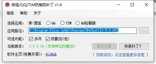 注意:微信/QQ/TIM更新之后要重新安装补丁!