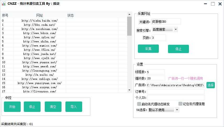 cnzz统计来源引流工具(cnzz来源多线程引流采集助手)是一款很优秀好用的支持CNZZ来源多线程引流采集的辅助工具。小编带来的这款CNZZ统计来源引流工具功能强大全面,操作简单便捷,使用后可以帮助用户轻松的进行CNZZ来源多线程引流操作,非常实用。软件覆盖全行业,可以自己导入网址,也可以输入关键词采集,操作很简单。有需要的朋友快来下载使用吧!