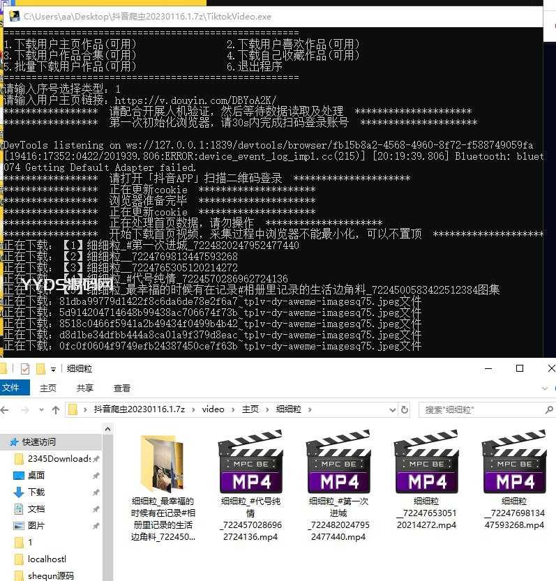 1、爬取主页、喜欢:首先会判断抖音接口并重启一次浏览器,请在30秒内通过人机验证,等待抓取主页的第一批视频结束,然后会自动滑动浏览器加载新视频,程序会自动检测新视频并下载