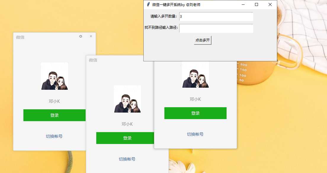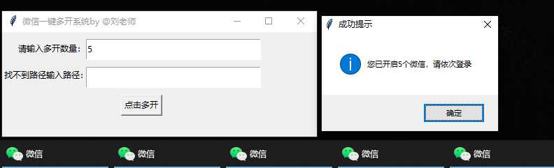 当前位置: 首页软件工具电脑软件正文 简介: 自己写的微信多开工具,用的python写的,之前一直用代码,干脆自己直接写了一个,和代码的原理是一样的,只不过增加了手动输入安装路径,正常安装到C或者D盘没有修改路径的都是可以直接打开的 这样子的效果,杀毒软件不会报毒的(用的火绒)个人所写。大神不要喷哈 注意:不要打开太多,为了防止意外我设置了最多打开100个。 图片: pc多开微信 收藏 链接