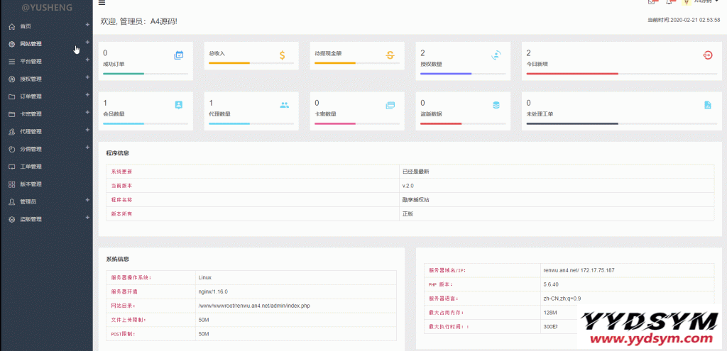 1、网站基本管理、系统设置、公告设置、接口设置、价格设置、下载设置。