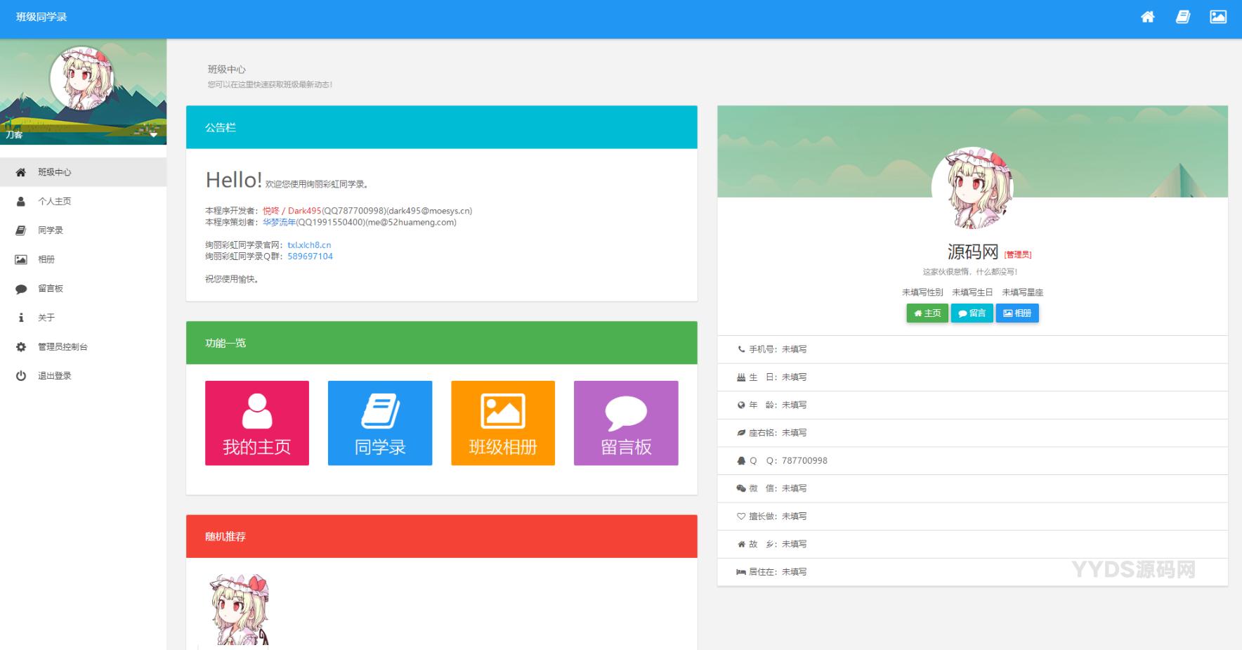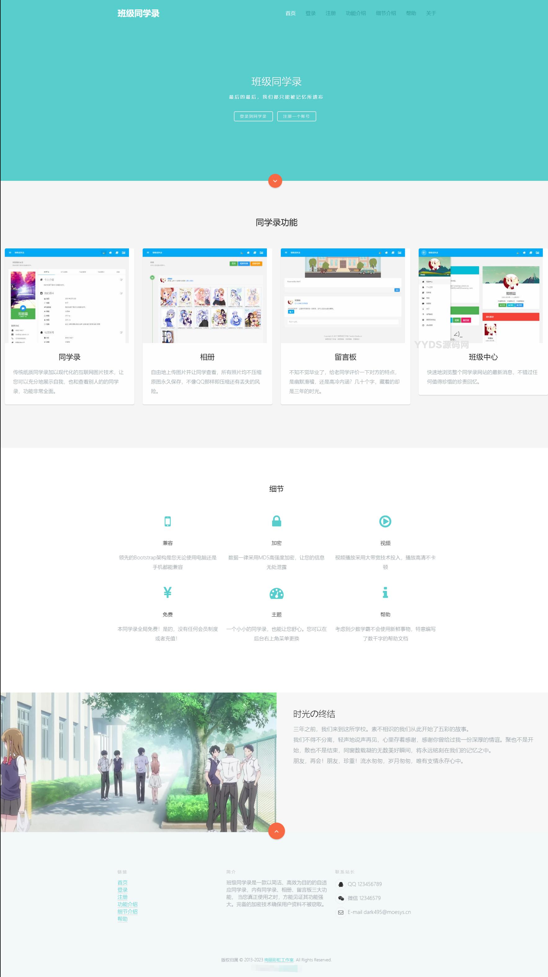 绚丽彩虹同学录是一个开源的电子同学录程序,V1.5 fix版本完全无加密源码,包含个人主页、同学录、相册、留言板等三大功能。个人主页功能可填写个人信息,定制个性化主页;同学录功能可查看全班同学的主页;相册功能可自由上传图片,保存期限设为永久;设计理念是极简化、精致化,让用户更加高效地使用每一个功能,不使部分功能荒废。建议尝试使用此轻便、强大、私密的同学录程序,源码完全无加密。